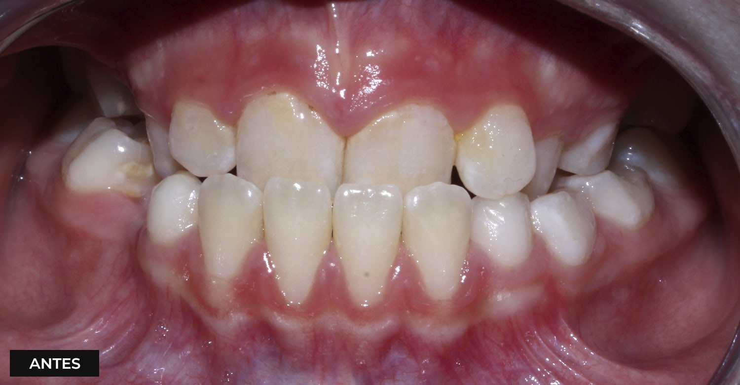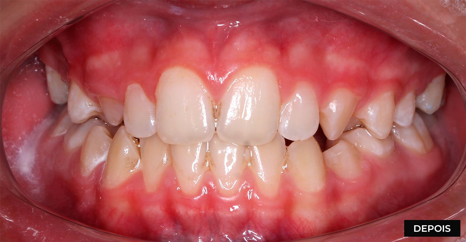 Iniciou-se o tratamento precoce com um disjuntor palatino para permitir uma disjunção dos maxilares e resolução da mordida cruzada.