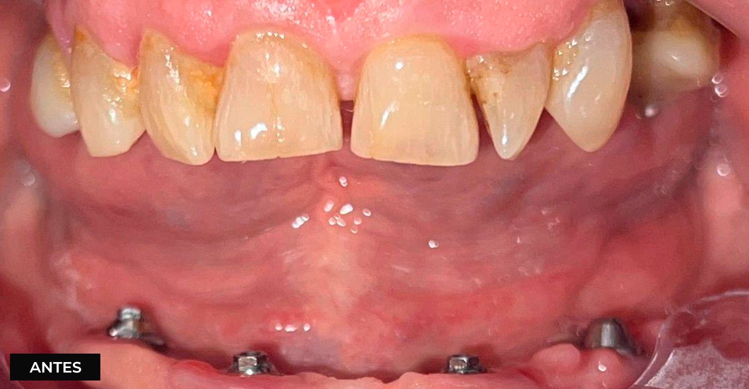 A paciente apresentava poucos dentes e estes com mobilidade impossibilitando uma boa mastigação e falta de estética do sorriso.